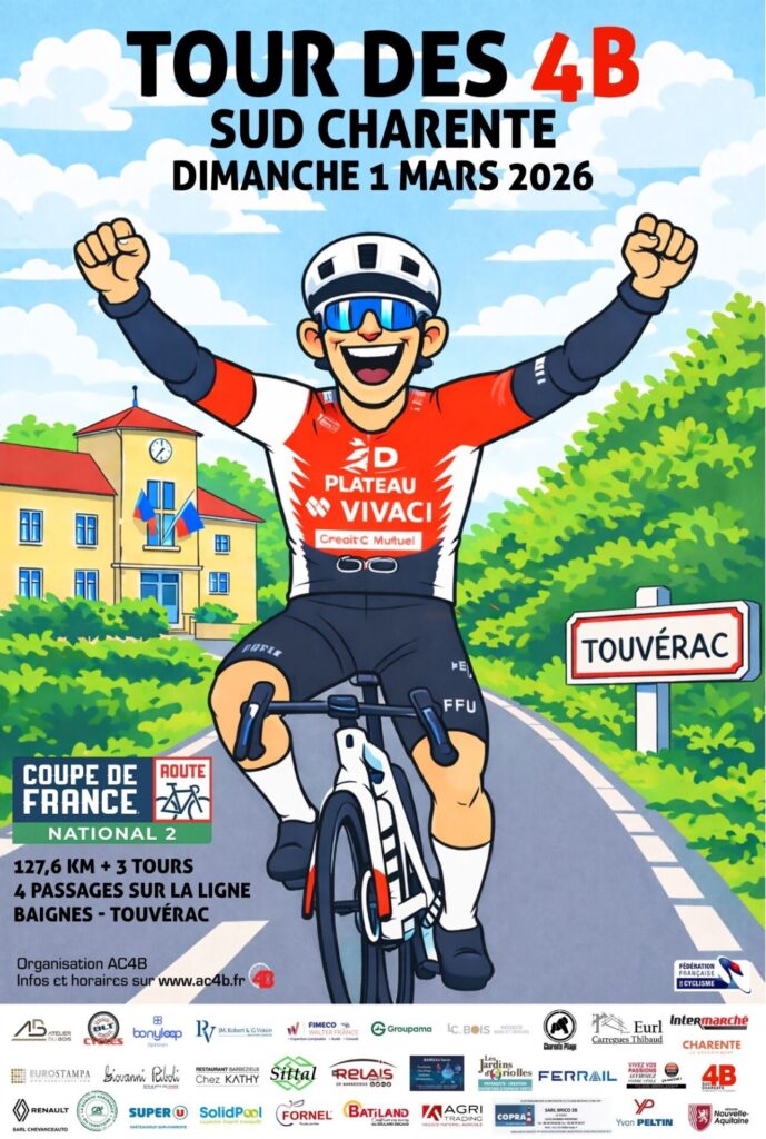 La 7ème édition de l’épreuve cycliste du TOUR DES 4 B SUD CHARENTE se déroulera le 1er mars 2026.